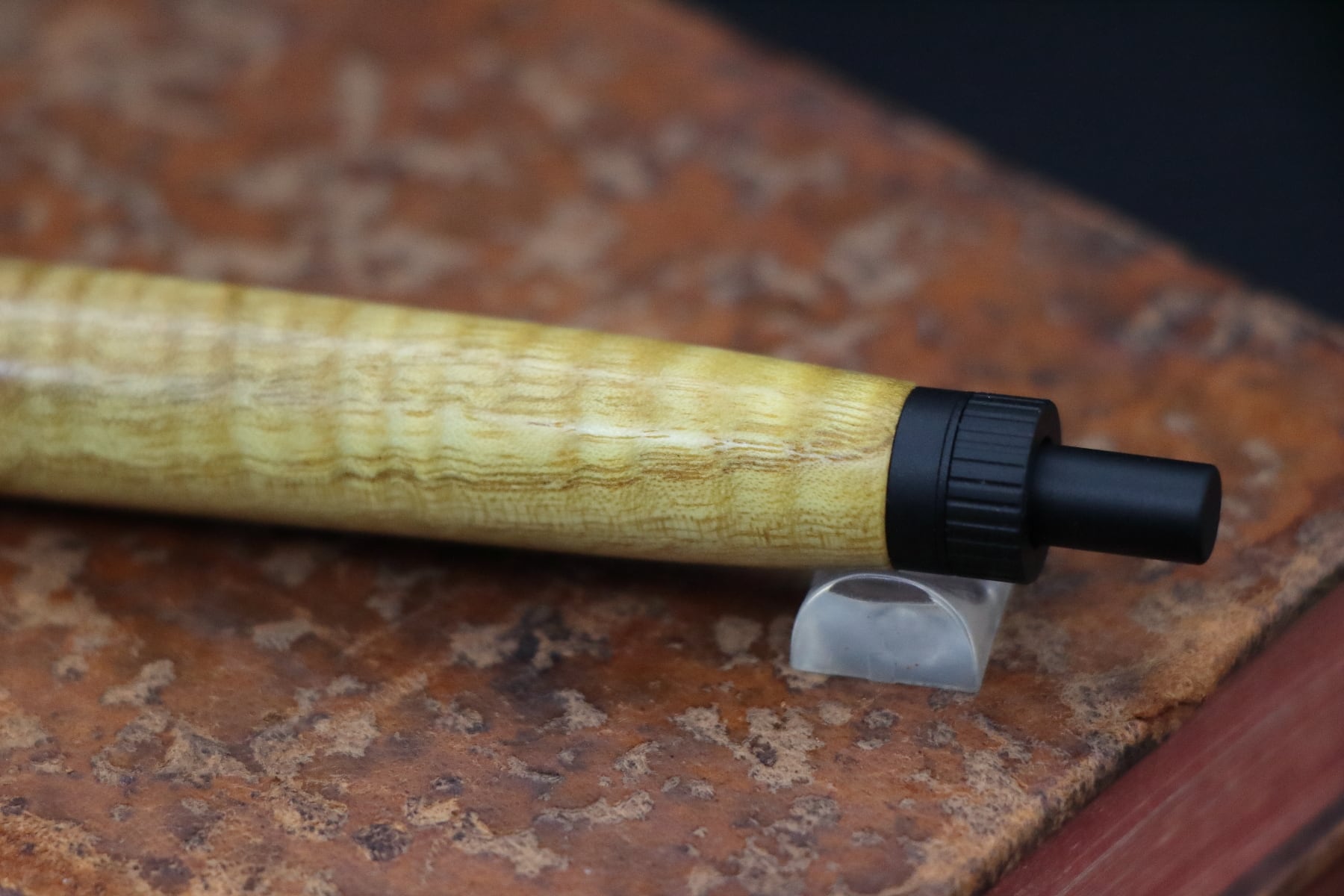 今回ペンにした材は、黄色から褐色の肌に、きらめく様な金色の美しい構造色をお楽しみいただける縮杢模様を持つ材になります。