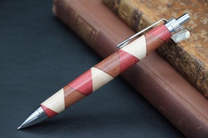 こちらの作品は、世界の銘木から3種の色違いの美しい木材を選び、寄木のブロックにしたのちに、その塊より削り出したトリコロール軸のペンです。