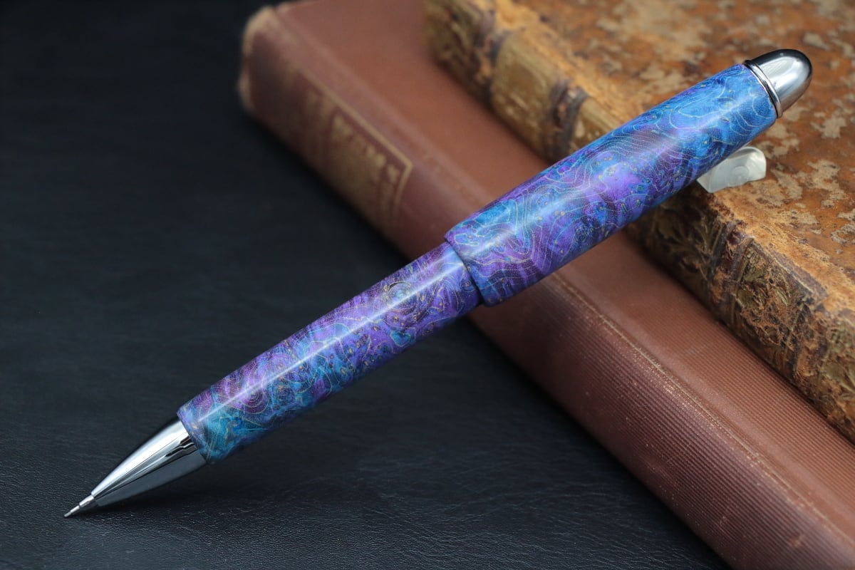 今回、この淡い色の木材の代表格とも言える「木材の真珠」であるメイプル材に、鮮やかなブルーの色彩を持つ特殊な樹脂を浸透させ、木材が持つ自然の模様の美しさと本来は木材には見られない鮮やかな寒色系の色との融合を実現したスタビライズドウッドを使いペンを制作致しました。