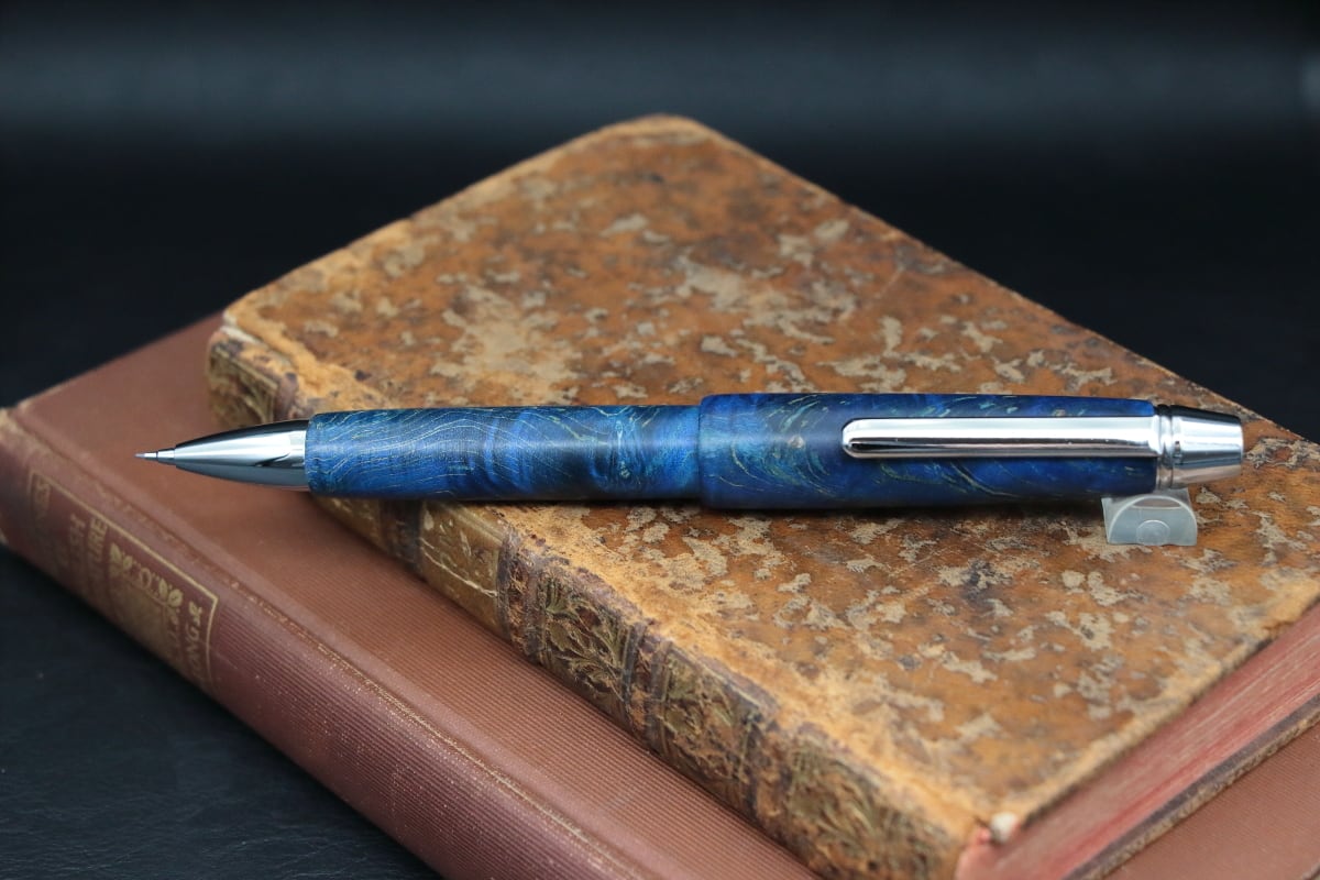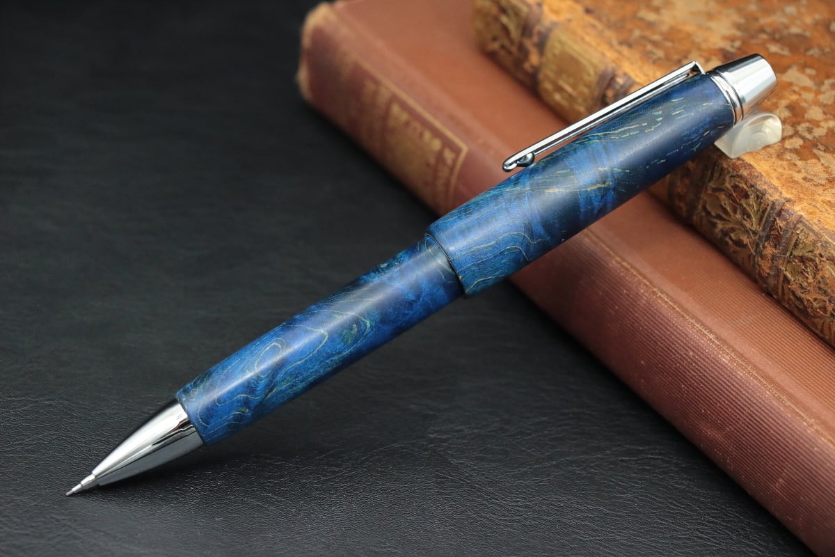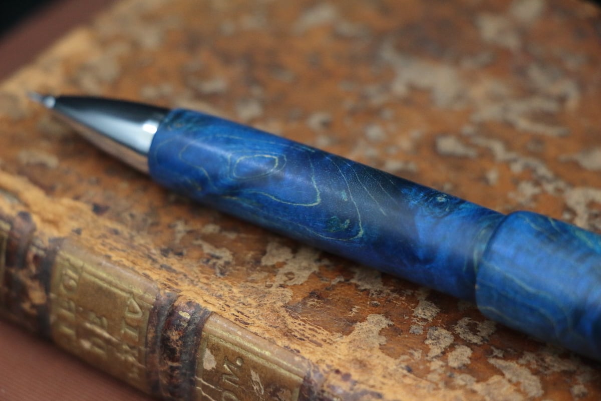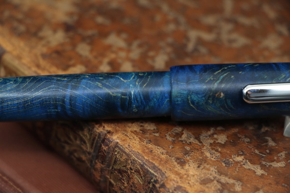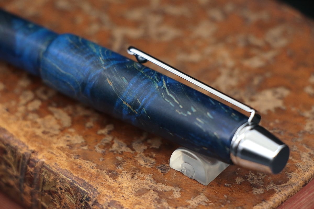 今回、この淡い色の木材の代表格とも言える「木材の真珠」であるメイプル材に、鮮やかなブルーの色彩を持つ特殊な樹脂を浸透させ、木材が持つ自然の模様の美しさと本来は木材には見られない鮮やかな寒色系の色との融合を実現したスタビライズドウッドを使いペンを制作致しました。