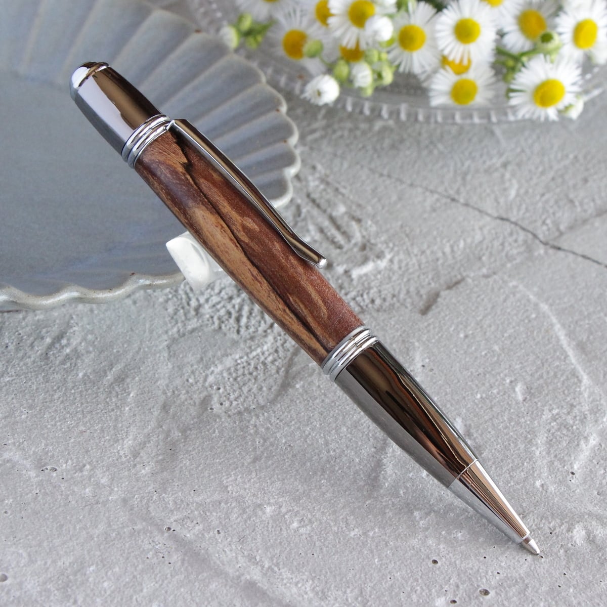 今回ペンに使用したユスノキは九州産のものになり、きめ細かく緻密な木肌となんとも言えない美しい天然の色合いが特徴的です。