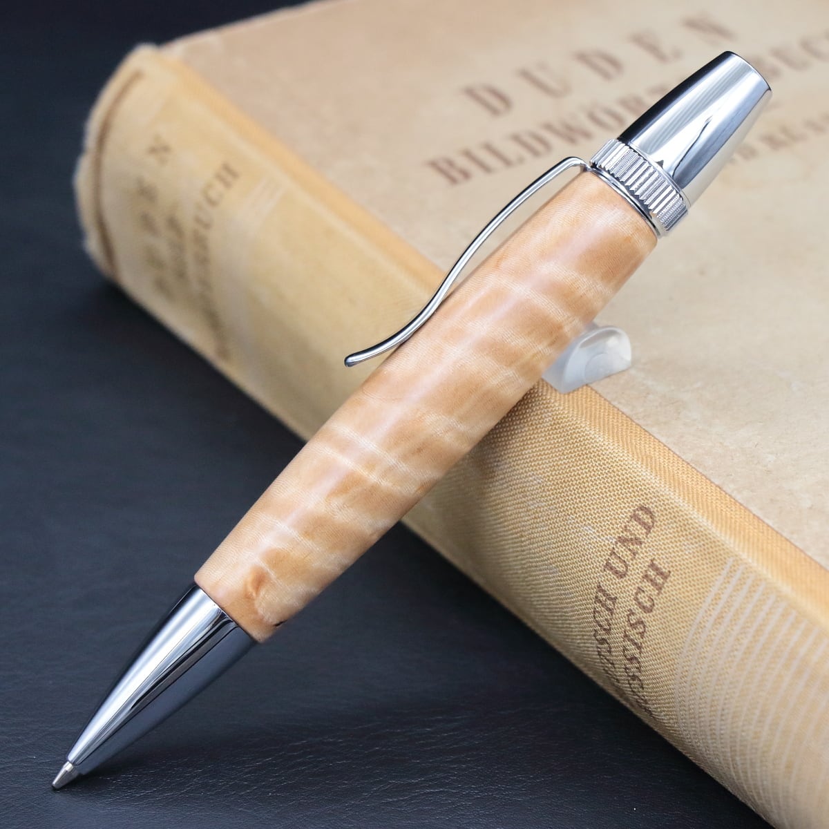 今回ペンに使用した材には、この淡い色の木材の代表格とも言えるメイプル材に「杢/もく」と呼ばれる模様が現れており、まるで光沢ある絹地に無造作にドレープを作り出したかのような美しく面白みのある景色を持つ部材です。