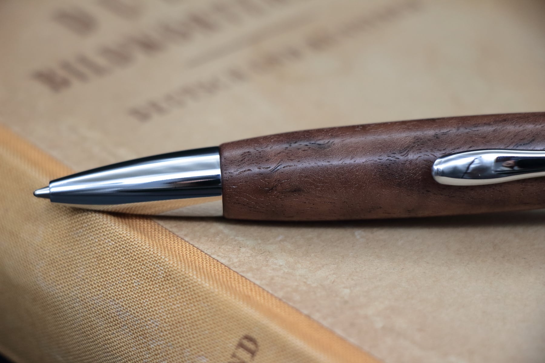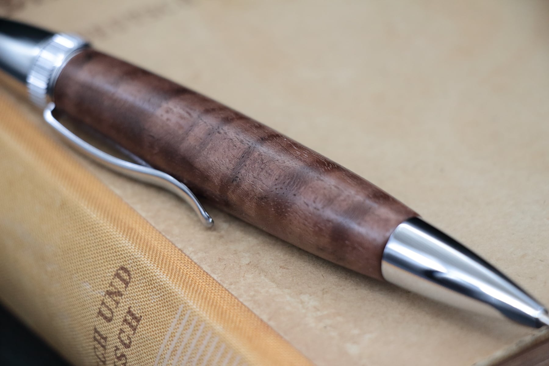 今回ペンに使用したブラックウォルナットの材は、しっかりしたチョコレート色に縮杢の模様のある美しい材になります。