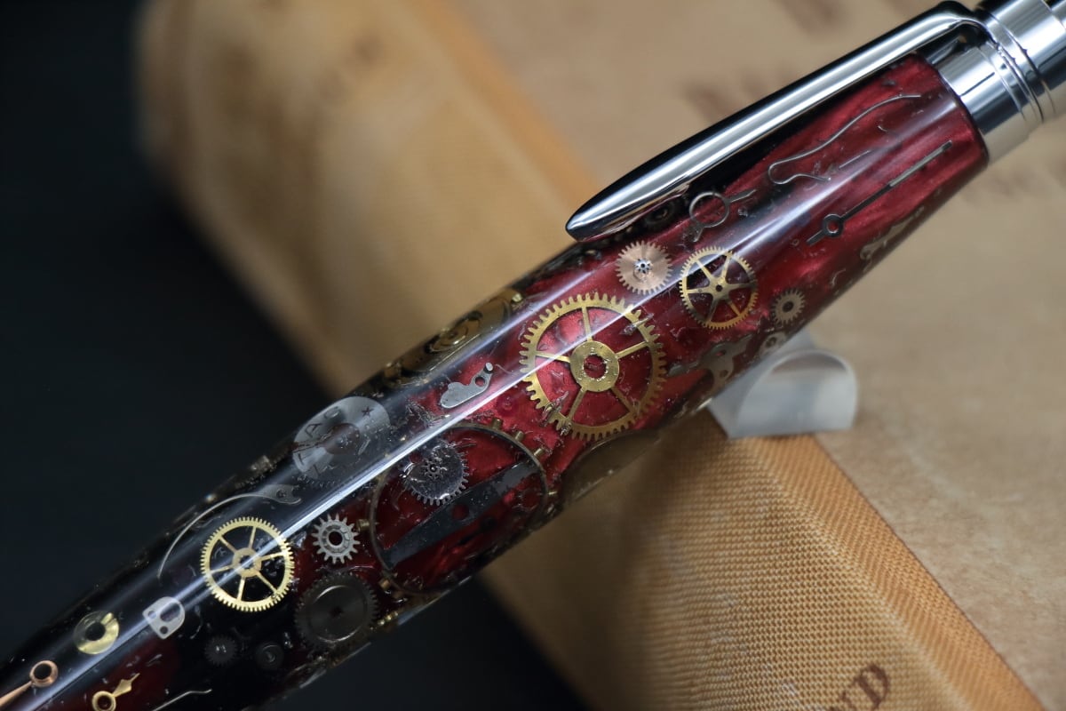 このルロックルより入手した、ヴィンテージのデットストックの時計パーツを1点づつ配置し透明度のあるアクリルで封入したペン軸を制作しました。