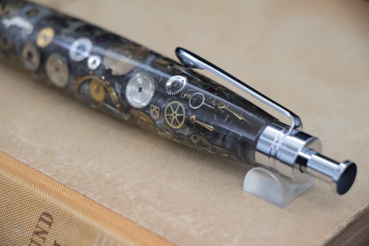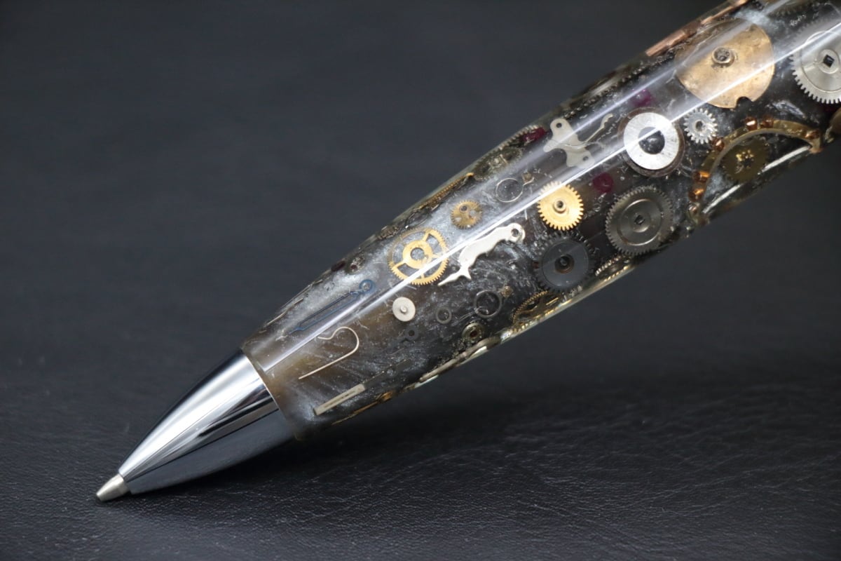 このルロックルより入手した、ヴィンテージのデットストックの時計パーツを1点づつ配置し透明度のあるアクリルで封入したペン軸を制作しました。