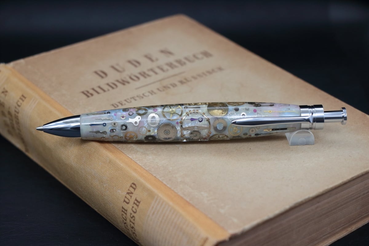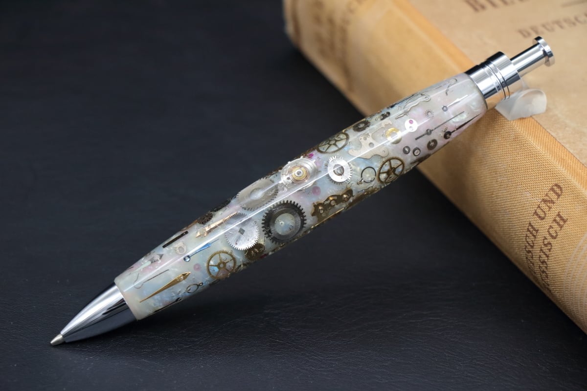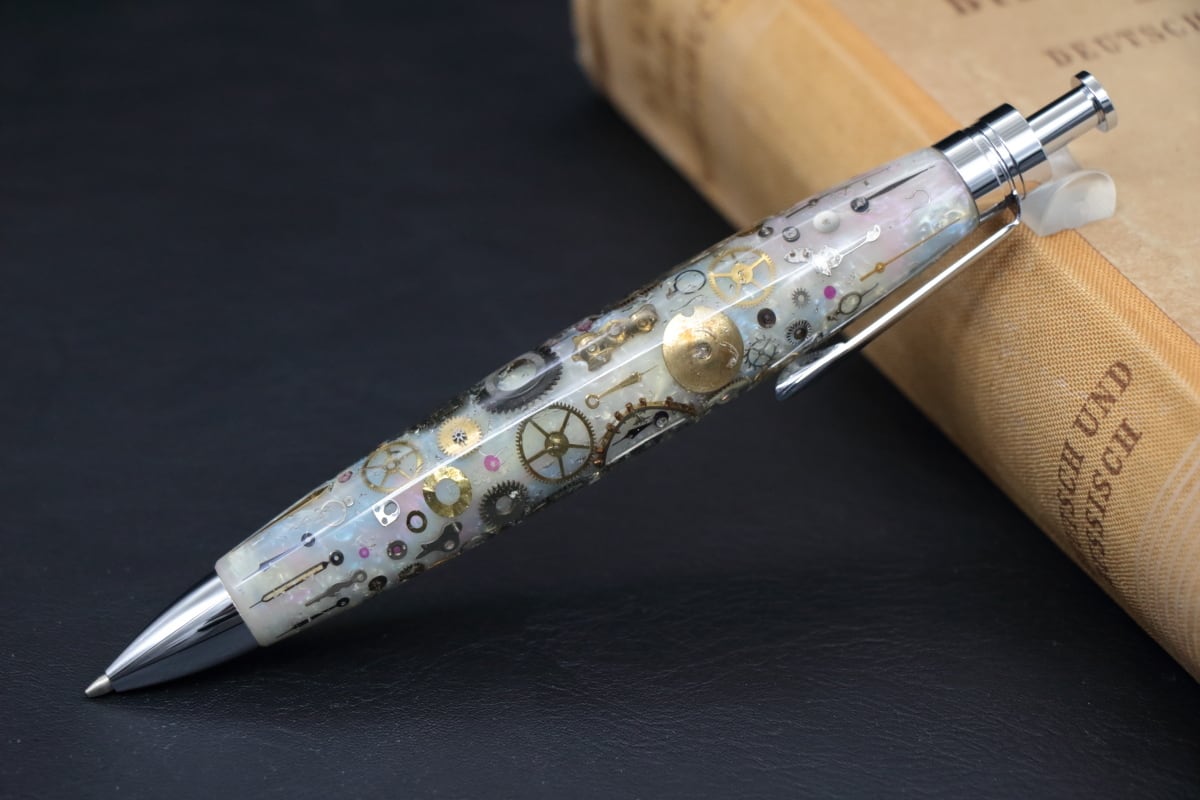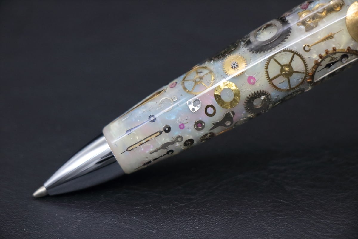 このルロックルより入手した、ヴィンテージのデットストックの時計パーツを1点づつ配置し透明度のあるアクリルで封入したペン軸を制作しました。