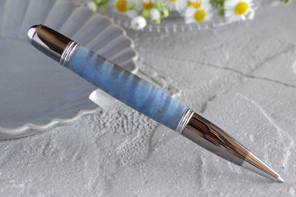 なるべく白さのあるメイプルのヴァイオリン杢の材に鮮やかなブルーを浸漬させて制作致しました。